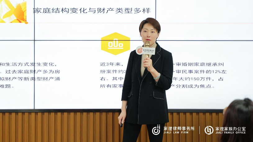 活动中,易轶律师全面解读了《解释(二)》重要亮点条款,分析了家庭结构与财产类型的发展趋势,详细介绍了新规在家事案件中的实务应用。