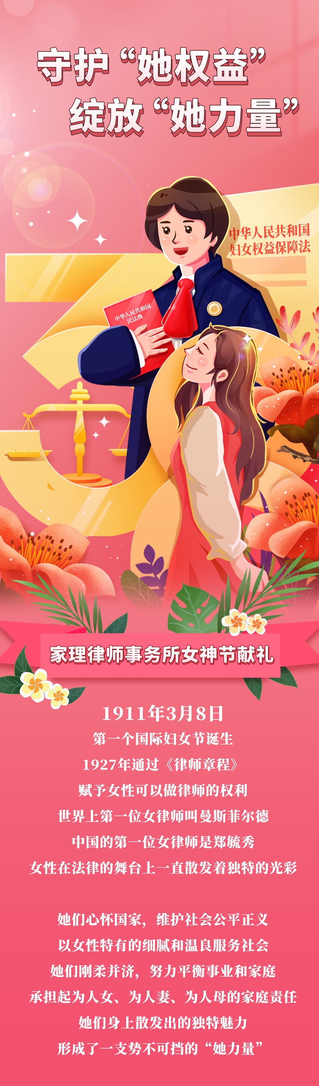 在这个特别的节日里,家理律师事务所特推出守护“她权益” 绽放“她力量”女神节献礼,帮助每一位女性更好地维护合法权益。