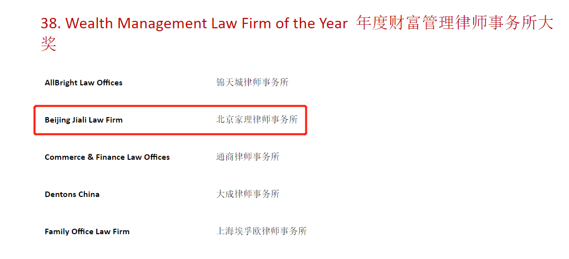 家理连续两年入围“年度财富管理律师事务所”大奖,反映了家理在财富管理领域所取得的突出成绩。