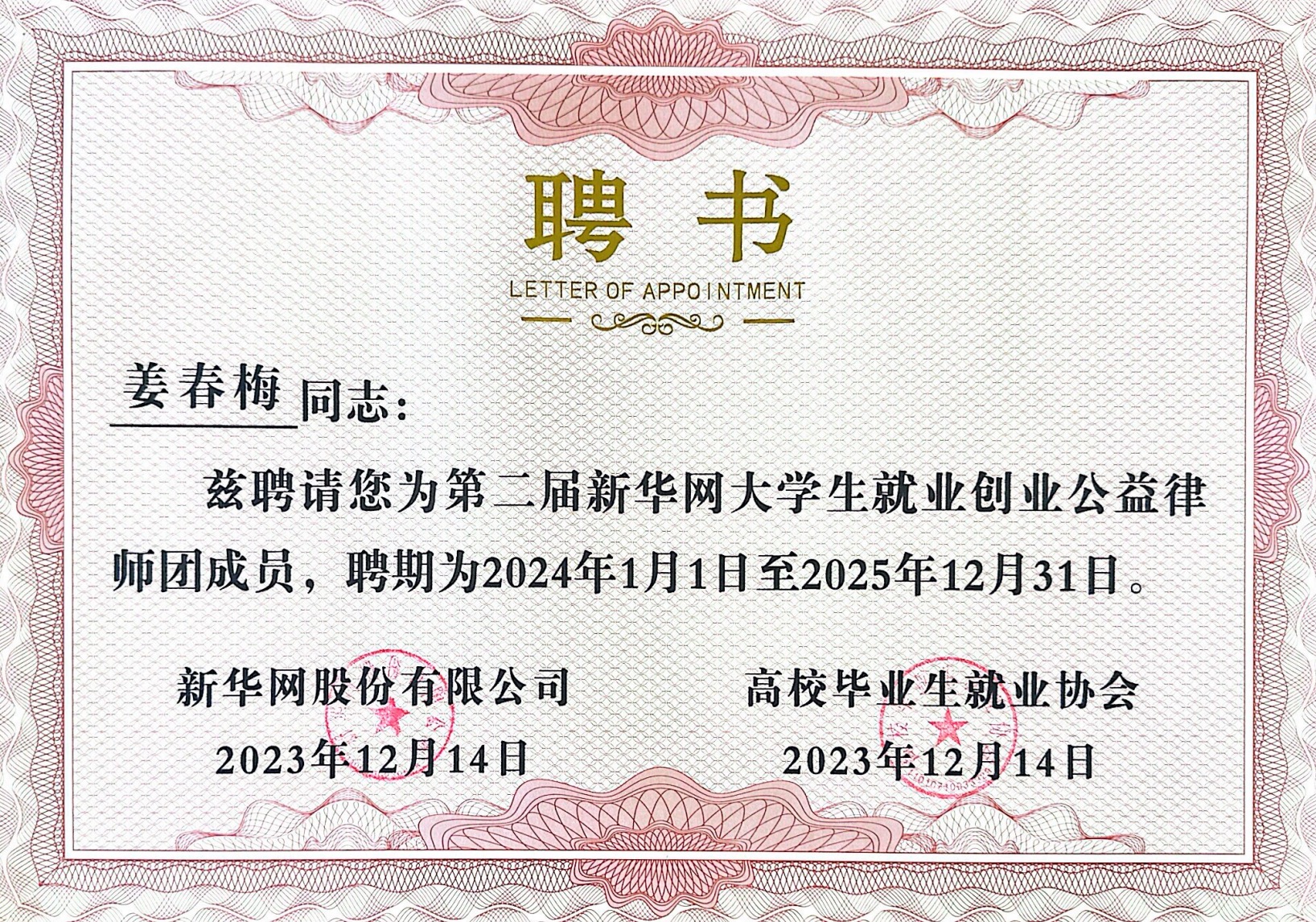 近日,由教育部学生服务与素质发展中心指导、高校毕业生就业协会主办的2023年高校毕业生就业协会年会暨全国大学生就业创业博览会在广西南宁成功举办。在大学生创业创新论坛上,举办了第二届新华网大学生就业创业公益律师团成员聘书颁发仪式。家理合伙人、主任姜春梅律师经过层层选拔,入选第二届新华网大学生就业创业公益律师团。