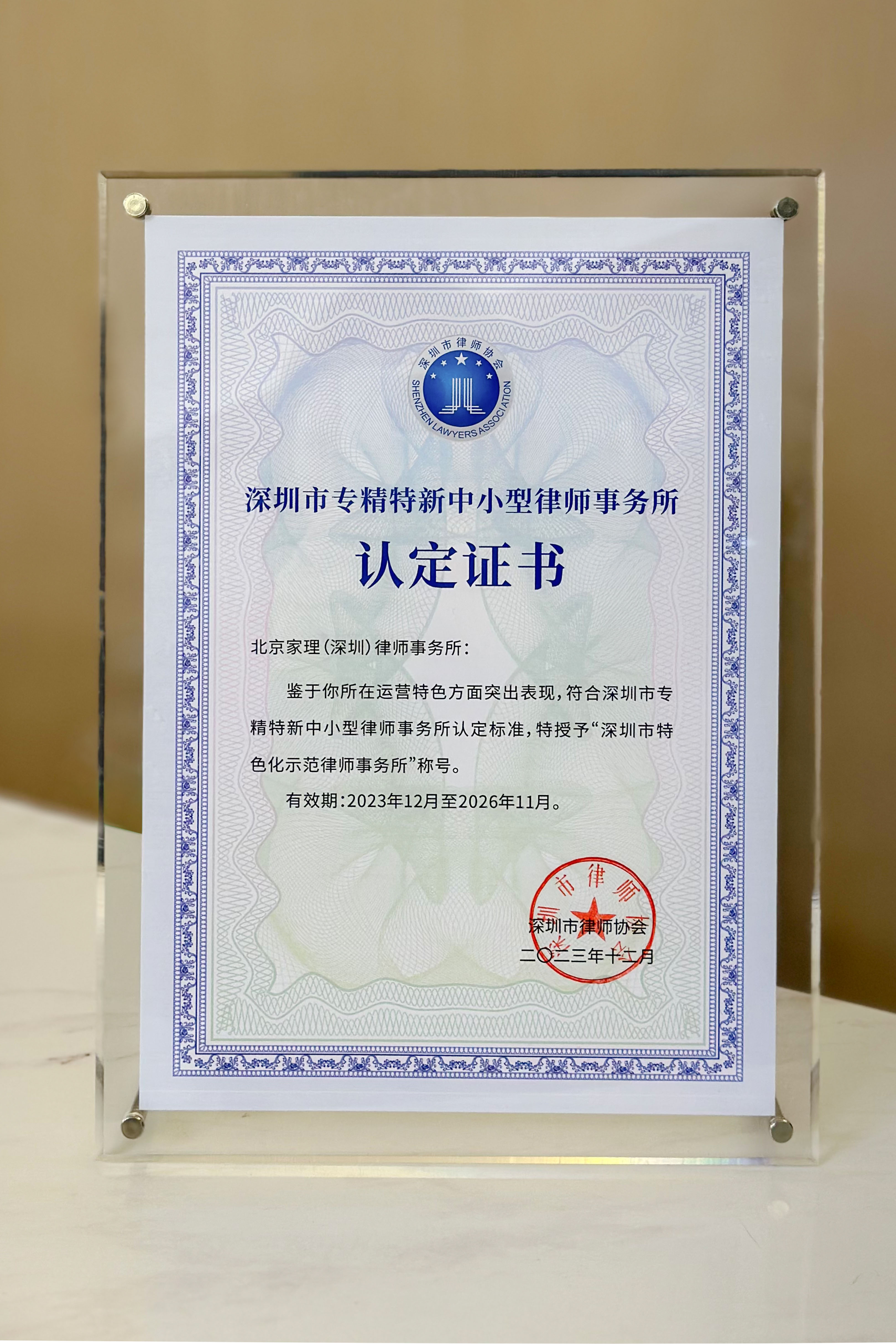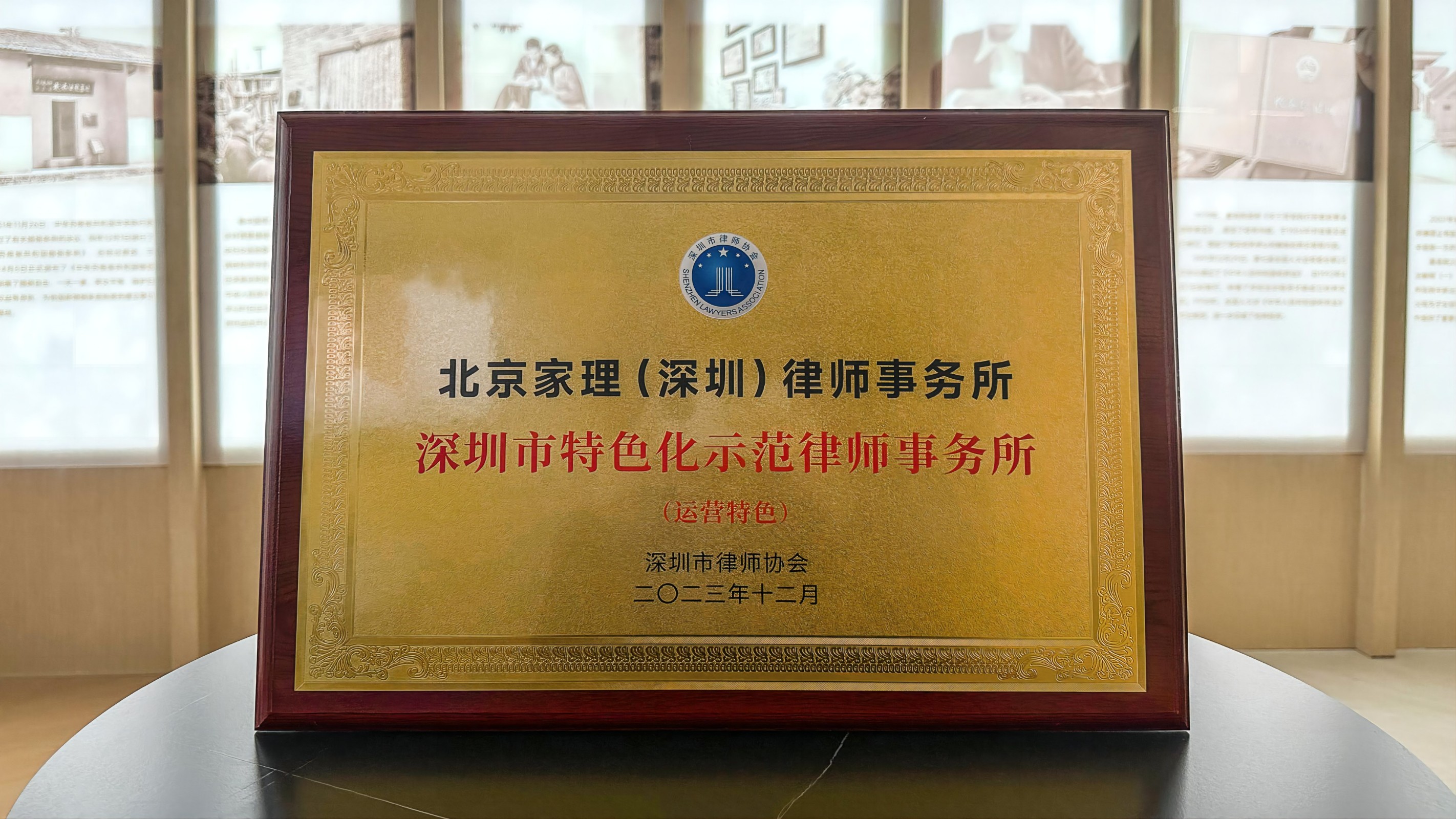 近日,深圳市律师协会公布了第一批深圳市专精特新中小型律师事务所名单,北京家理(深圳)律师事务所凭借在运营特色方面的突出表现,符合深圳市专精特新中小型律师事务所认定标准,被授予“深圳市特色化示范律师事务所”称号。