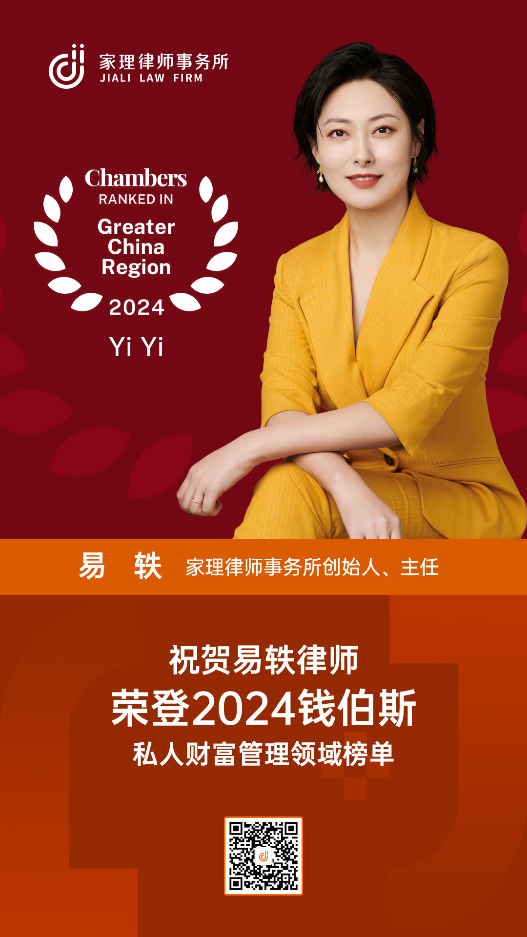 2024年1月18日,国际权威法律评级机构钱伯斯(Chambers and Partners)发布《大中华区指南2024》(Greater China Region Guide 2024),家理律师事务所创始人、主任易轶律师凭借在财富管理领域的卓越表现,荣登“私人财富管理”(Private Client/Wealth Management)领域榜单。从2022年到2024年,易轶律师已连续三年入选该榜单。