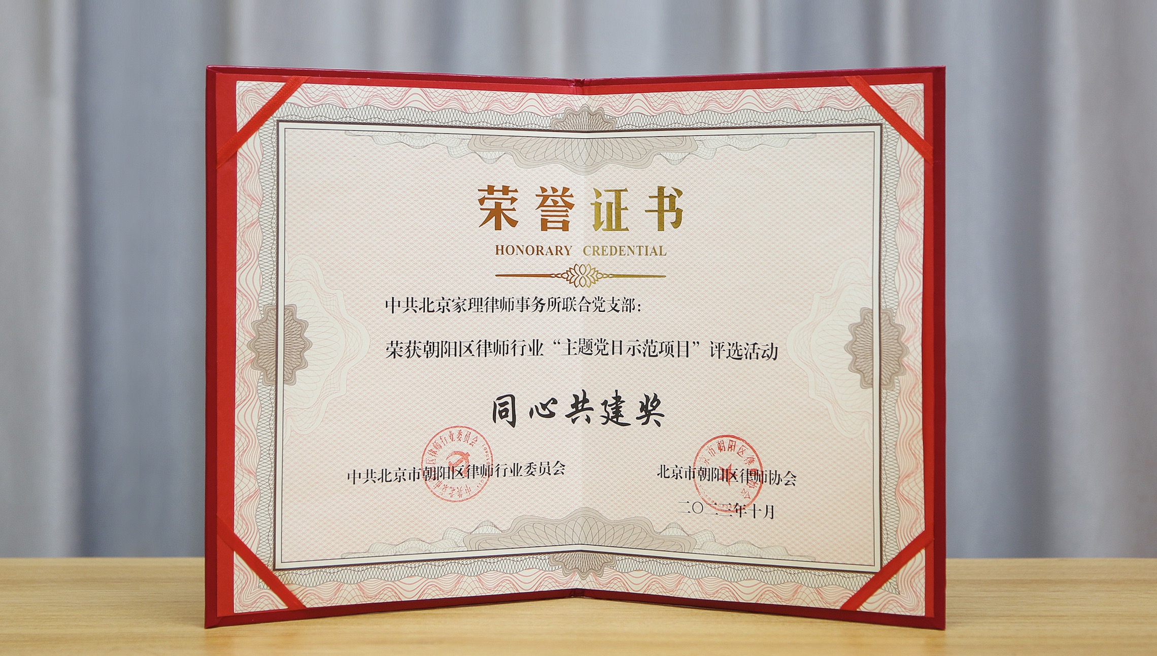 经过评选,该申报项目获得中共北京市朝阳区律师行业委员会、北京市朝阳区律师协会授予的“同心共建奖”,家理联合党支部纪检委员谢志会同志代表家理领奖。