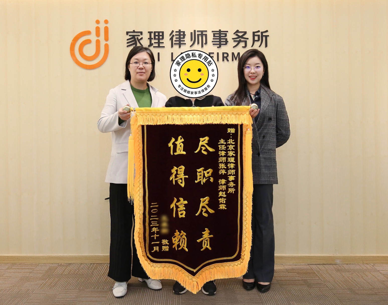黄女士对该结果的作出表示十分满意,故而赠送锦旗,以表示对家理婚家律师的认可。
