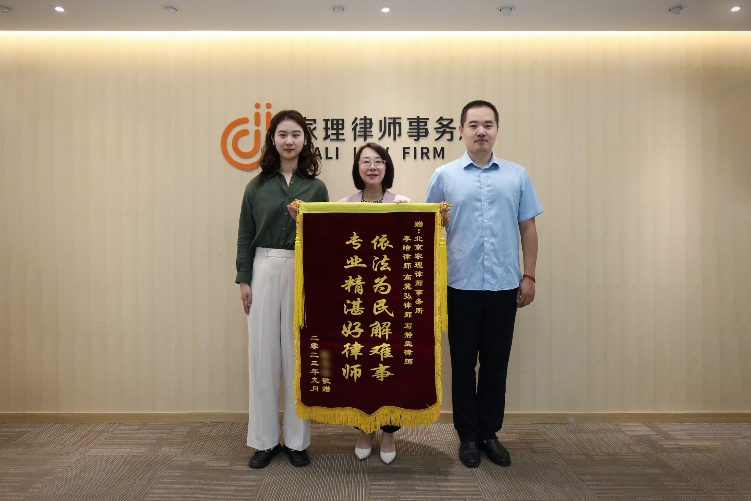 李先生对家理律师的专业能力和案件结果都非常满意,特赠送锦旗表示感谢。