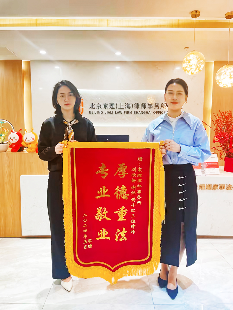 该诉讼结果的超预期达成,使得王女士的财产权益得到极大地保障,为表示感谢,王女士特意向上海家理的刘欣妍律师、黄子红(实习律师)赠送锦旗。