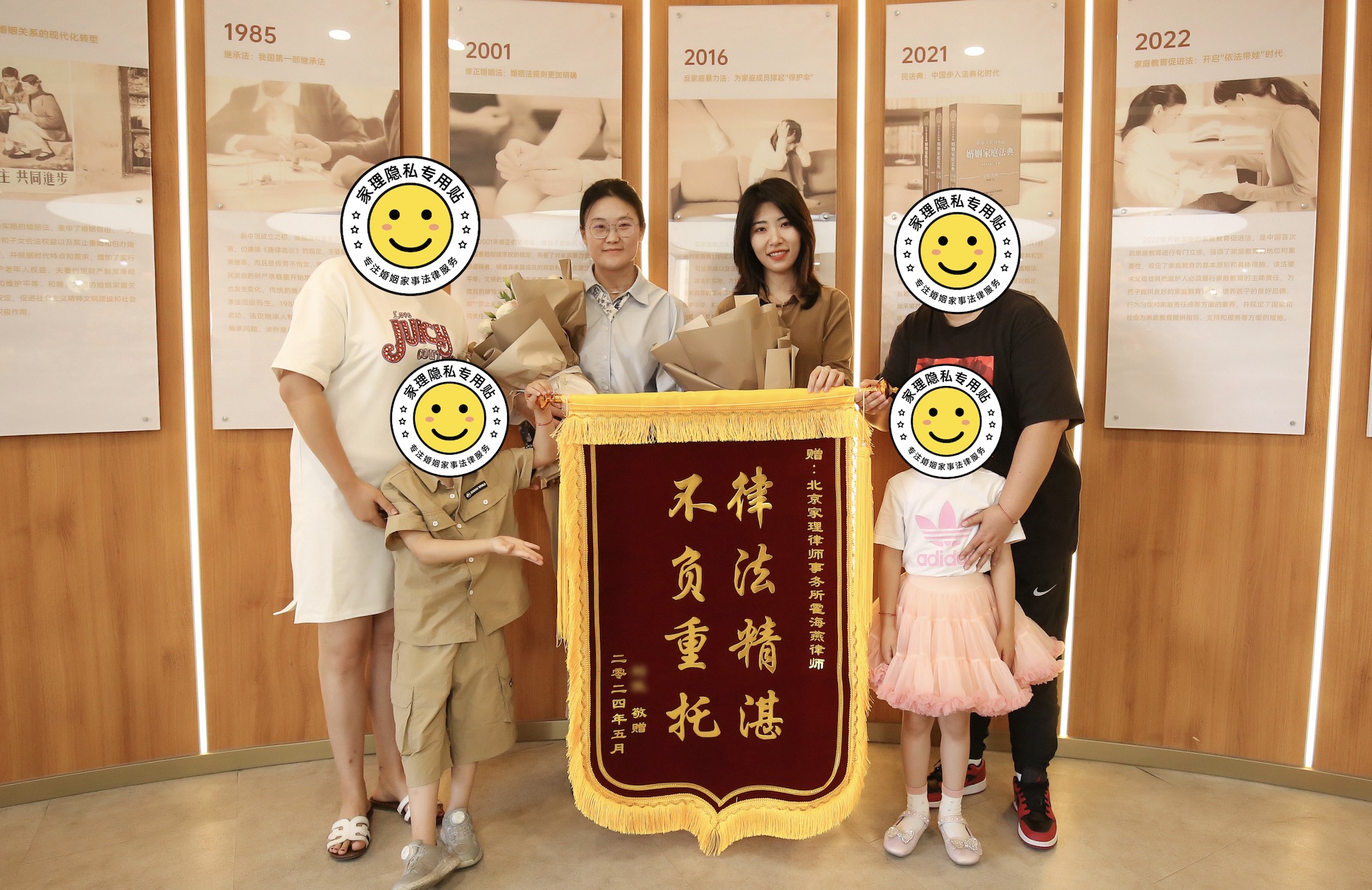 在承办案件过程中,家理律师与许女士及秦某一、秦某二建立起深厚的感情。在判决下发之日,龙凤胎兄妹俩手捧鲜花、拿着大大的锦旗再次到访家理律所,特意为北京家理的霍律师、杨霓(实习律师)赠送锦旗。