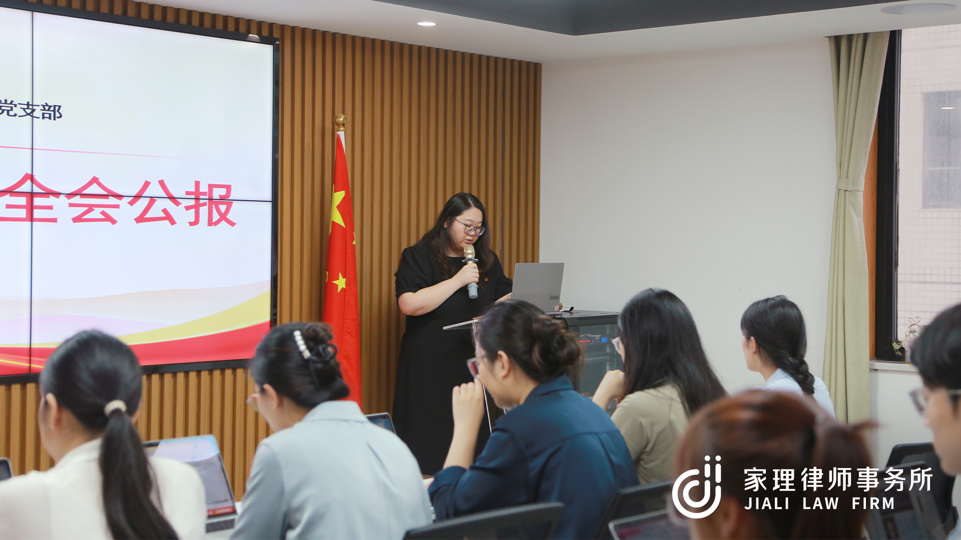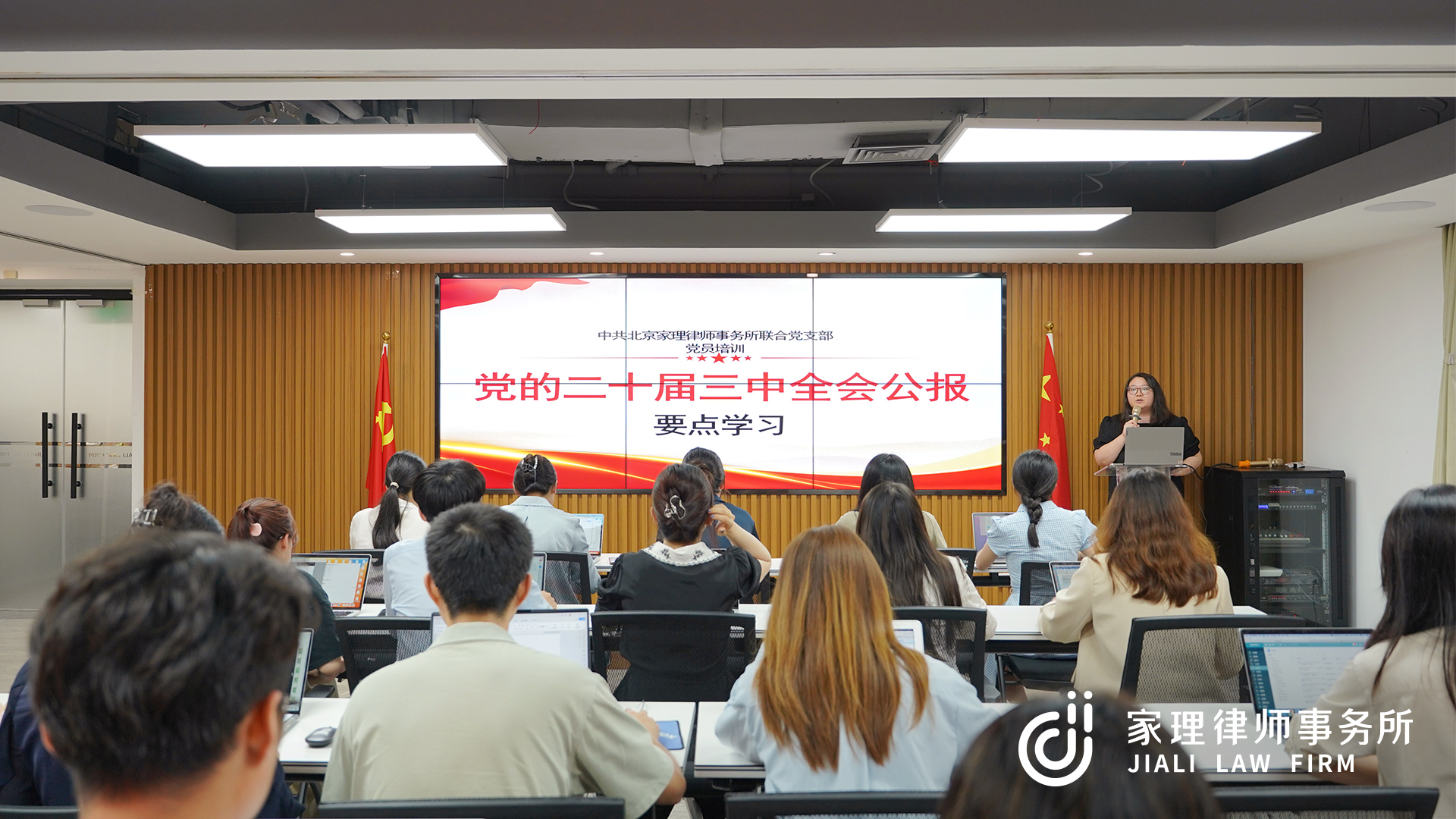 近日,中共北京家理律师事务所联合党支部(以下简称家理联合党支部)全体党员律师在北京家理的三层多功能厅开展党员培训活动,集中学习党的二十届三中全会公报的要点。本次活动由宣传委员王红月律师进行授课讲解并担任主持。