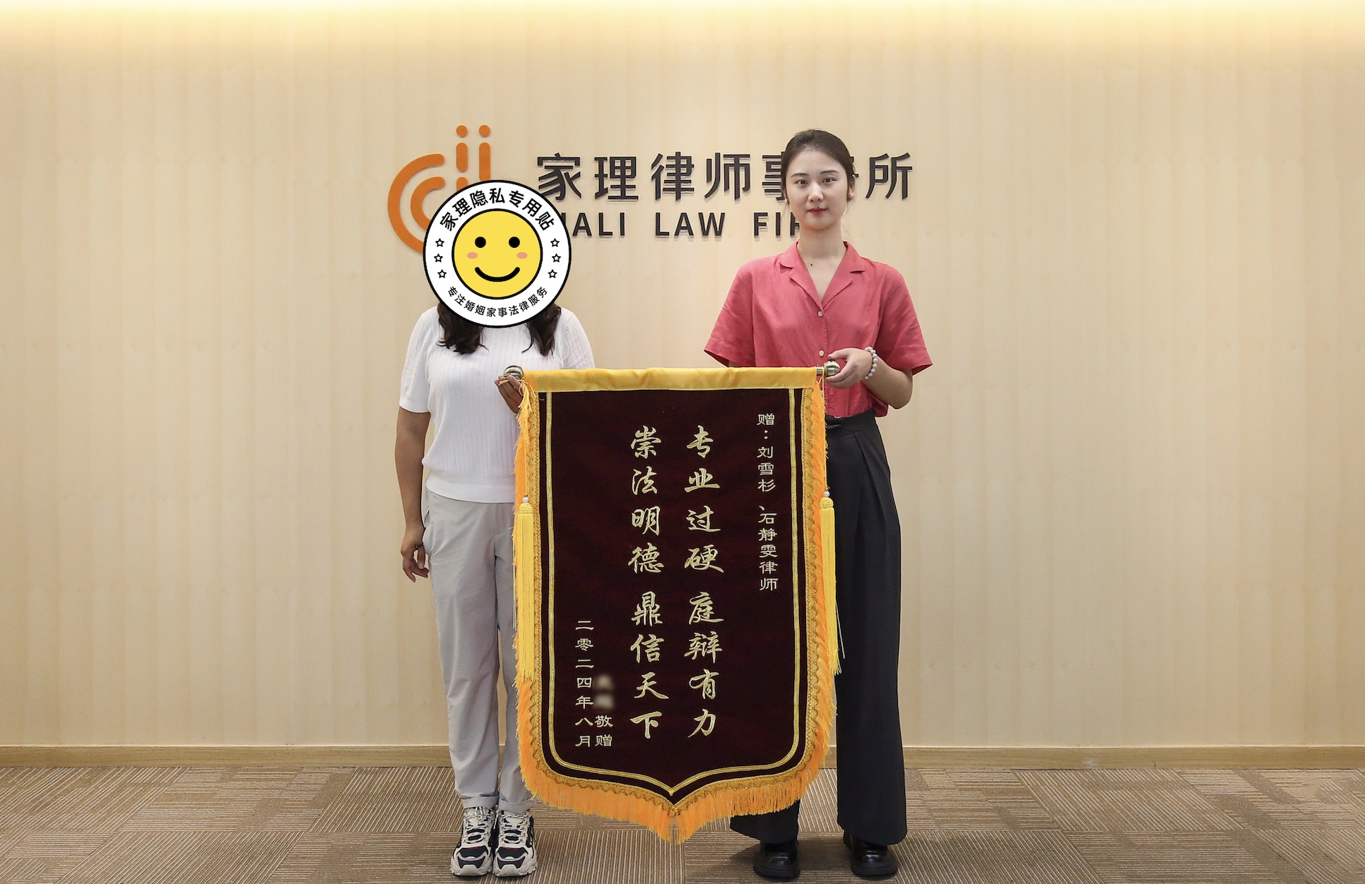 原女士的权益得到极大保障,为表示感谢,在收到判决之日,特意前往家理律所,为北京家理的刘雪杉律师、石静雯律师赠送锦旗。