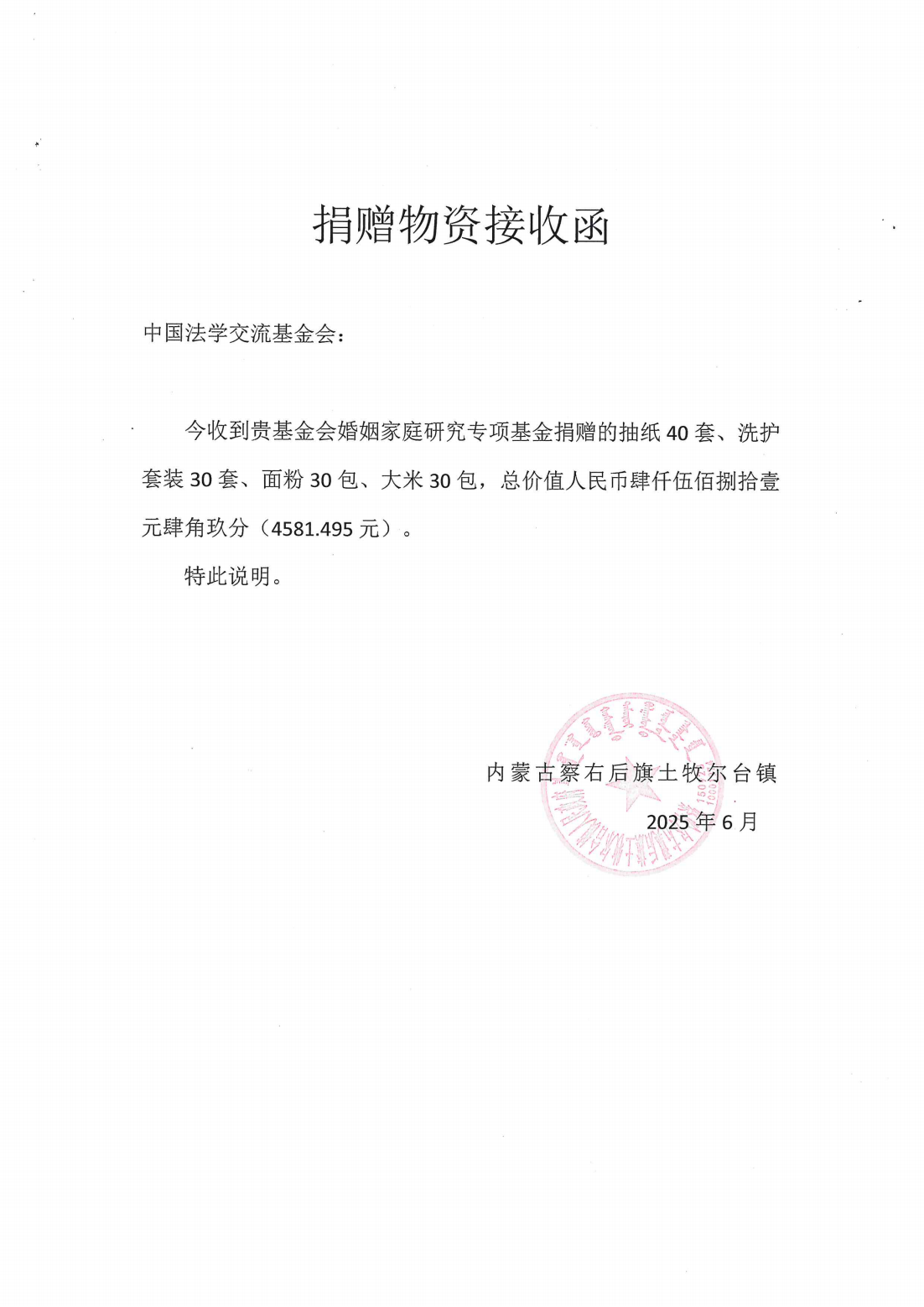 (三)2025年6月,家理律师事务所联合中国法学交流基金会、中国法学交流基金会婚姻家庭研究专项基金向内蒙古自治区乌兰察布市察哈尔右翼后旗乌兰哈达苏木和土牧尔台镇捐赠了价值逾万元的生活保障物资。